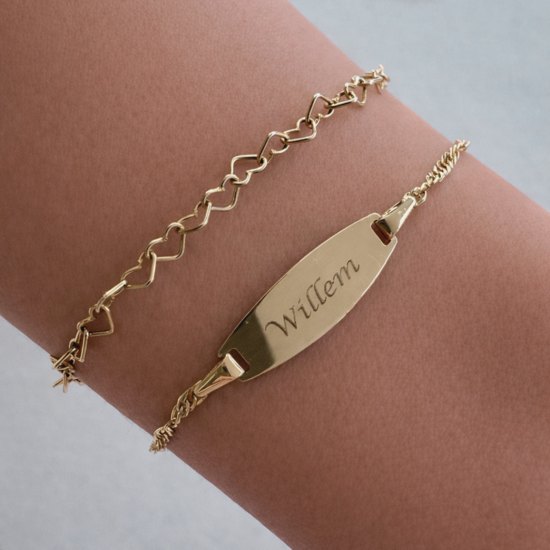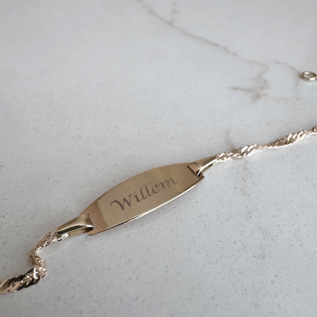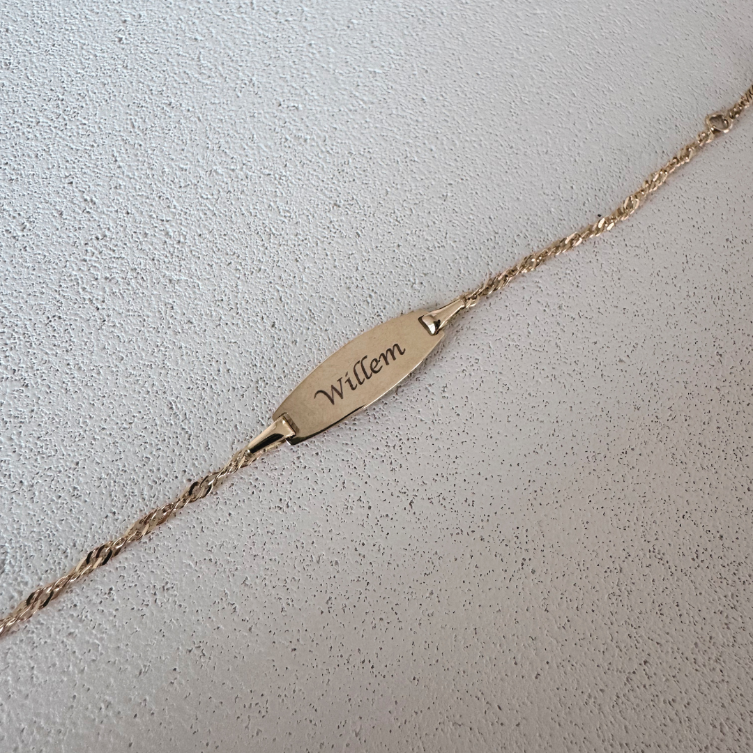 18K geel gouden baby armband met naamgravure. Leverbaar in 1 à 2 weken.