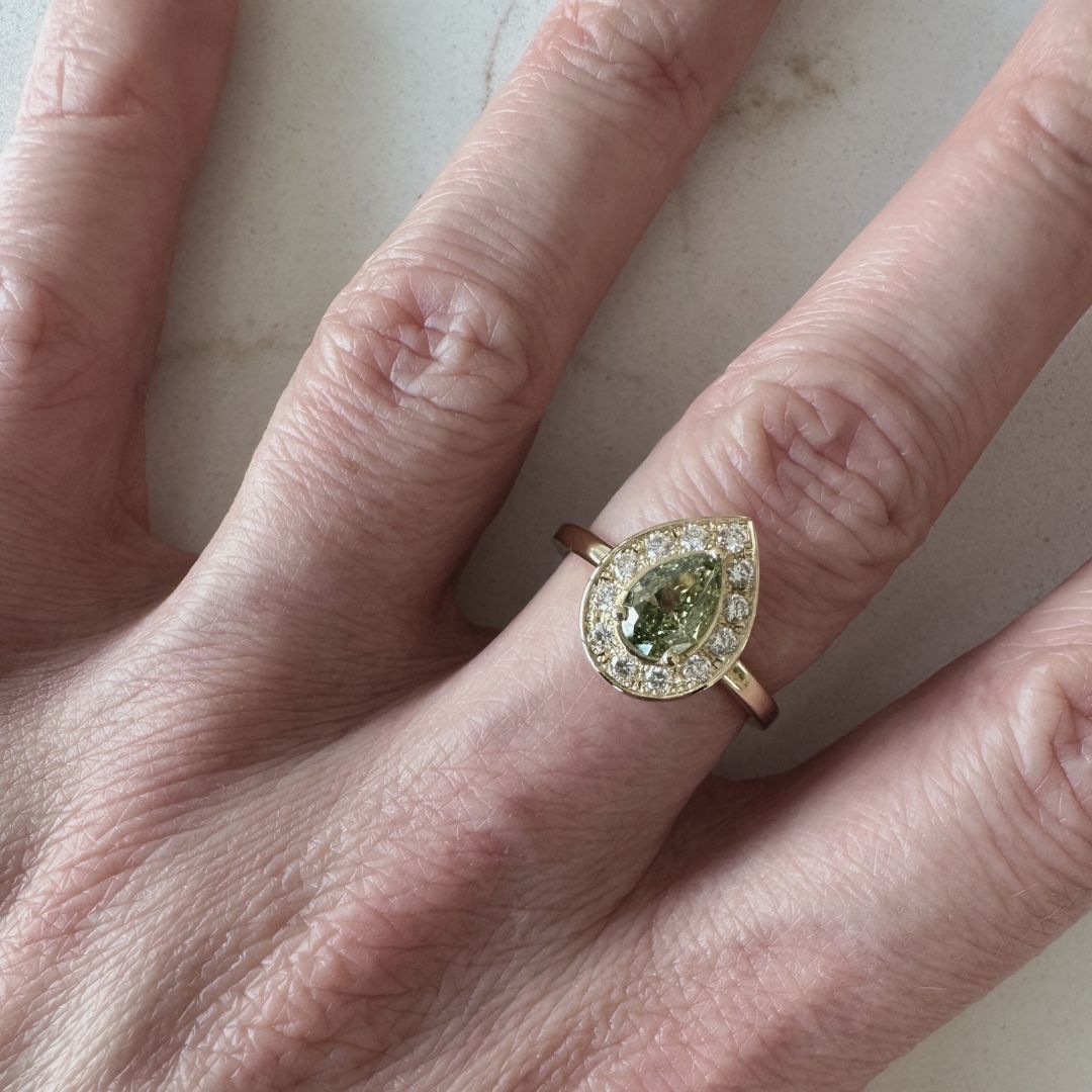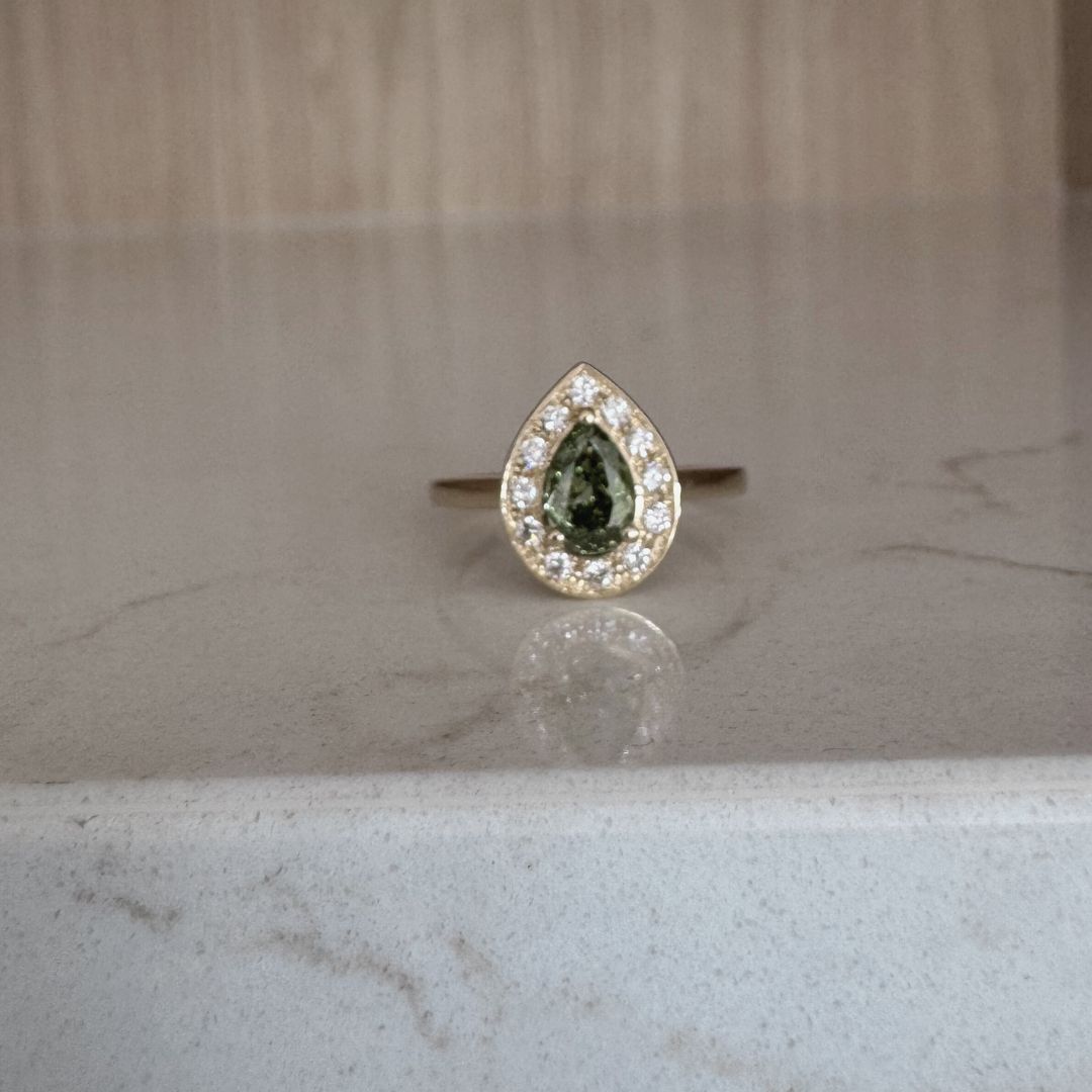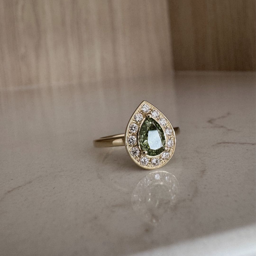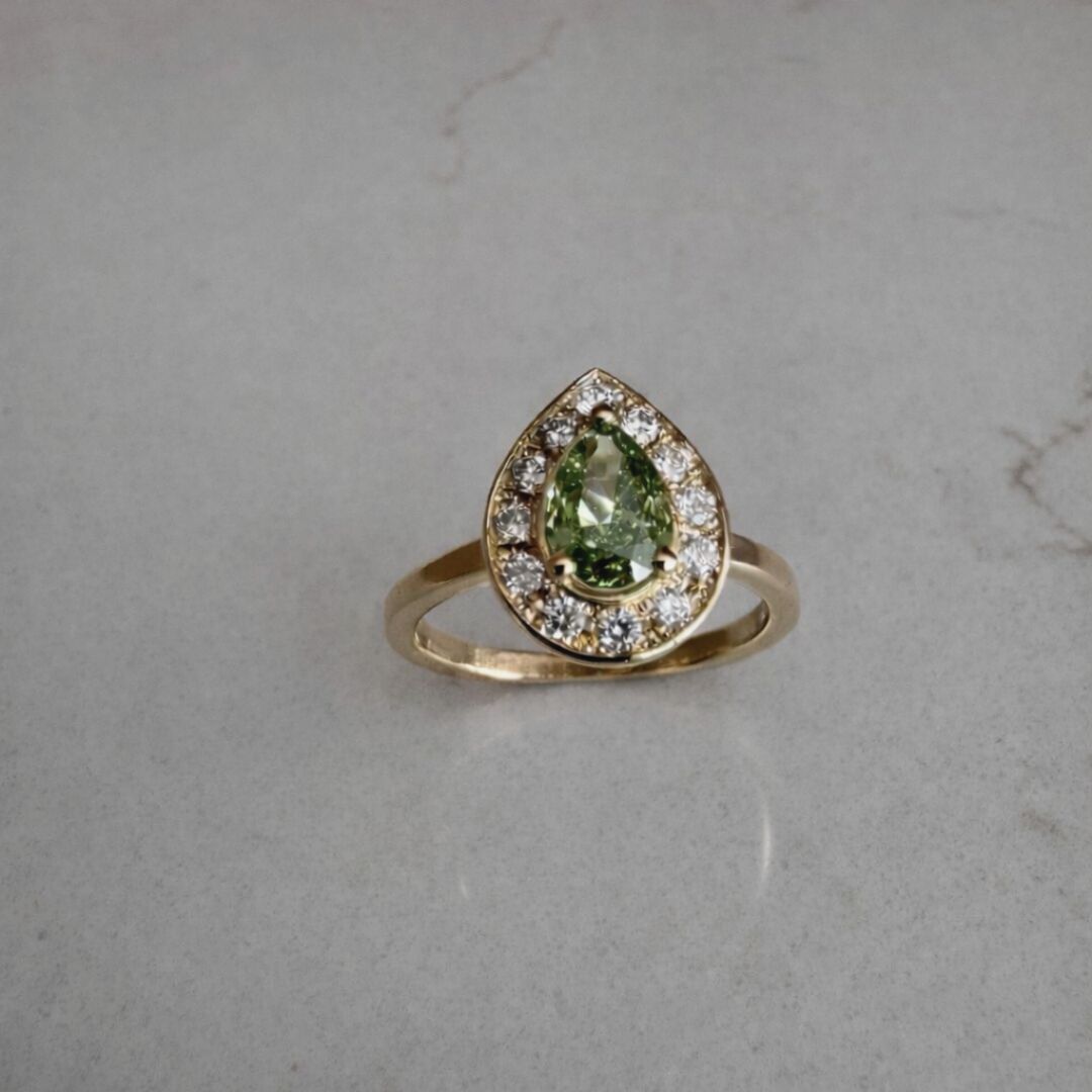 Groene peervormige diamant met halo (mini diamantjes) in 18K geel gouden ring. Prijs steeds op aanvraag. Niet op voorraad.