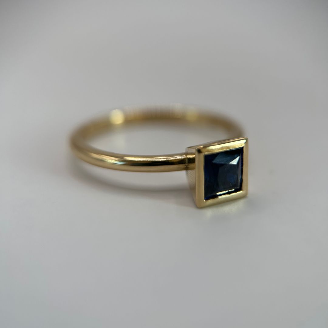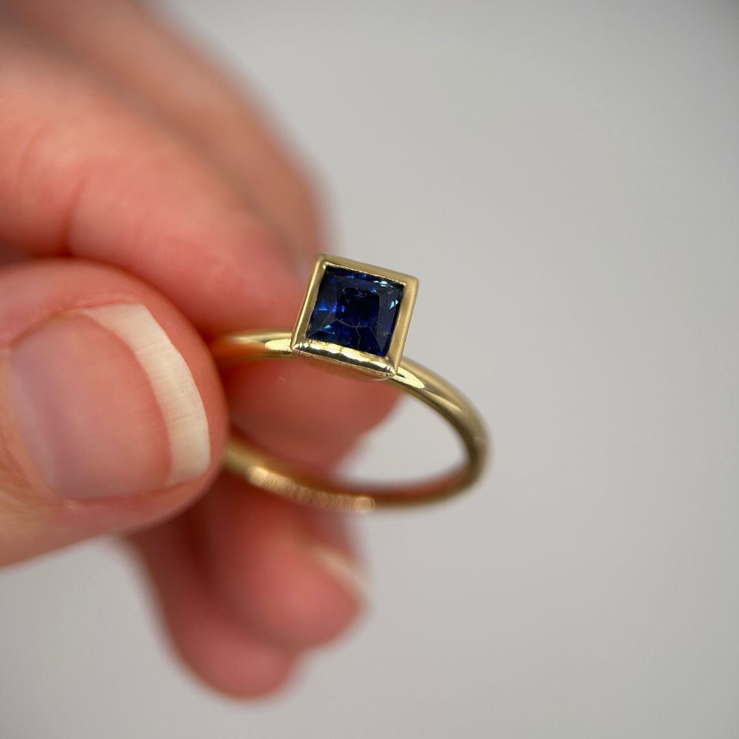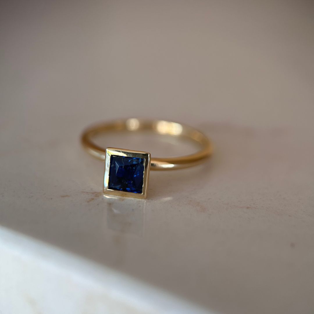 18 karaat geel gouden ring met diepblauwe saffier. Bij dit juweel heb je de mogelijkheid om as onder de steen te plaatsen.